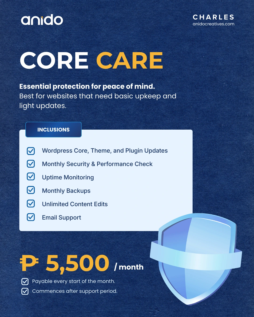 Essential protection for peace of mind. Best for: Websites that need basic upkeep and light updates.
